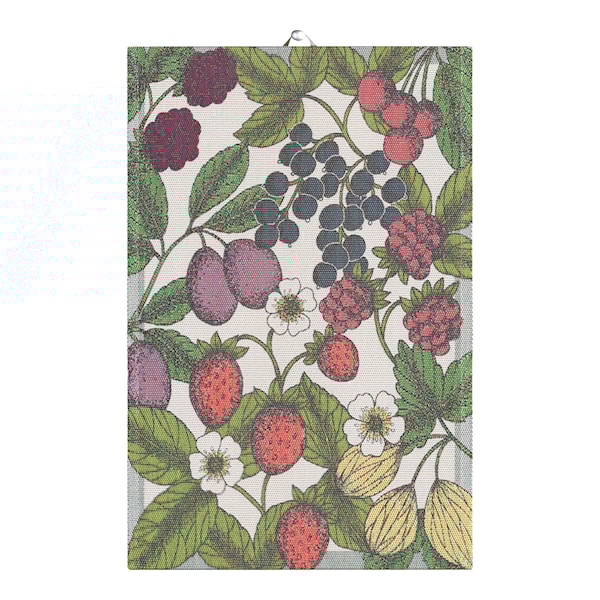 Trädgårdsbär Handduk 40x60 cm är ett mönster forgivet av Betty Svensson för Ekelunf Linneväveri. Mönstret är en härlig blandning av våra vanligaste bärsorter mot en ljus bakgrund som får färgerna att framträda ytterligare.