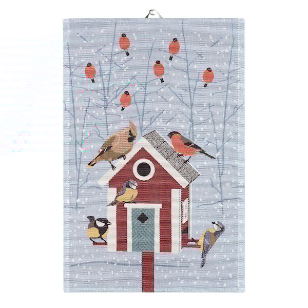 Handduk Vintermat från Ekelund är formgiven av Kristina Petrauskiene och kommer garanterat att höja julstämningen i köket. Fantastiskt motiv med domherrar och andra fåglar som samlas vid fågelbordet. Tillverkad av 100% ekologisk bomull, vilket ger en behaglig och slitstark kvalitet.