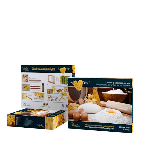 Det här är ett perfekt set för dig som vill börja göra din egen pasta hemma på ett smidigt och enkelt sätt. Setet innehåller allt du behöver för att plocka fram din inre italienare och bli ett proffs på att göra din egen pasta. Setet innehåller alla verktyg du behöver för att förbereda hemlagad pasta i världsklass till gästerna, familjen eller någon du tycker om. Skärhjulen är tillverkade av rostfritt stål och övriga pastatillbehör är gjorda i vackert bokträ.