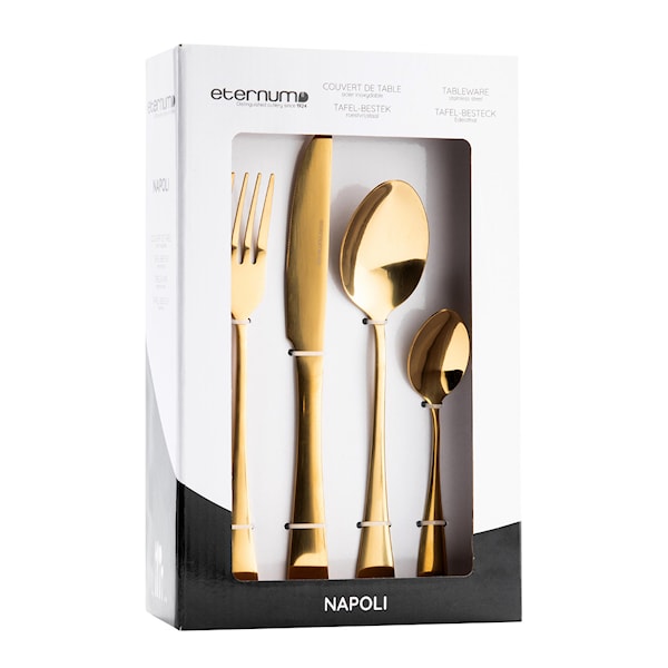 Napoli bestickset från Eternum är ett funktionellt val för daglig användning. Setet innehåller 16 delar – fyra gafflar, fyra knivar, fyra matskedar och fyra teskedar – och erbjuder en komplett lösning för fyra personer.