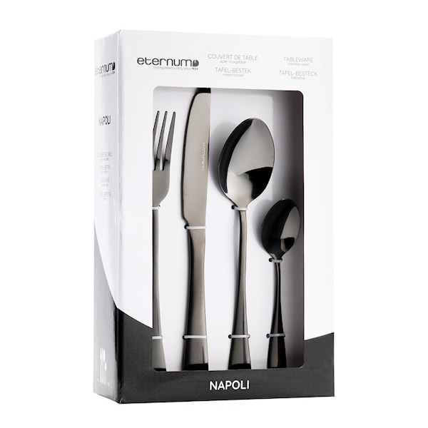 Napoli bestickset från Eternum är ett funktionellt val för daglig användning. Setet innehåller 16 delar – fyra gafflar, fyra knivar, fyra matskedar och fyra teskedar – och erbjuder en komplett lösning för fyra personer.