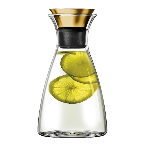 Den mässingsfärgade detaljen ger ett elegant, tidlöst uttryck som fungerar lika bra till vardag som till fest. Karaffen rymmer 1 liter, är bekväm att greppa och tål diskmaskin.