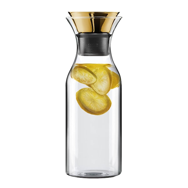 Kylskåpskaraff med vipplock 1 L Mässing från Eva Solo är tillverkad i värmebeständigt glas och kan användas till både vatten och vin. Tillbringaren passar i de allra flesta kylskåpsdörrar.