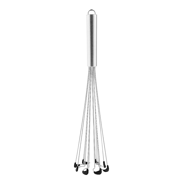 Visp från Eva Solo i rostfritt stål, med en funktionell utformning som gör den extra effektiv och smidig att arbeta med. Vispen förhindrar att klumpar bildas, och tack vare den platta designen når den hela vägen ut i kanten av kastrullen. Den kan även ställas direkt på botten i kärlet när den inte används. Vispens ändar är av silikon, vilket gör att den kan användas i kastruller och stekpannor med alla typer av beläggningar utan att repa.