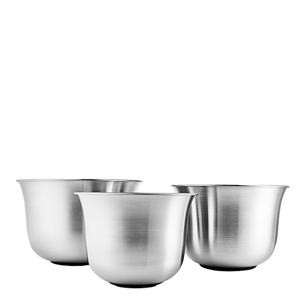 Bunkarna är tillverkade av 90 procent återvunnet *post-consumer* rostfritt stål, vilket ger en robust konstruktion som tål slag, repor och bucklor. De är tillräckligt slitstarka för att användas med elvisp, vispar och andra metallredskap utan problem. En gummiring i botten säkerställer att skålarna står stadigt på bänken, även vid kraftig vispning.