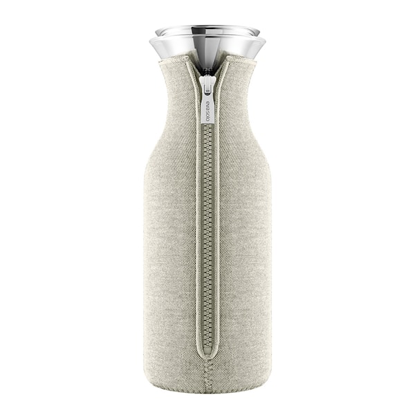 Det neoprenklädda överdraget med en utsida i vävt textil ger ett behagligt grepp, hjälper till att hålla temperaturen stabil och absorberar kondens så att bordet förblir fläckfritt. Glas- och metalldelarna tål maskindisk, medan överdraget kan tvättas i maskin på max 30 grader.