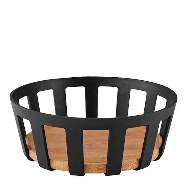 Tillverkad i svart plast med en botten i bambu, ger korgen en naturlig och modern känsla. Den passar lika bra till frukostbröd som till frukt eller sötsaker. Enkel att rengöra med en trasa och kan staplas för smidig förvaring.