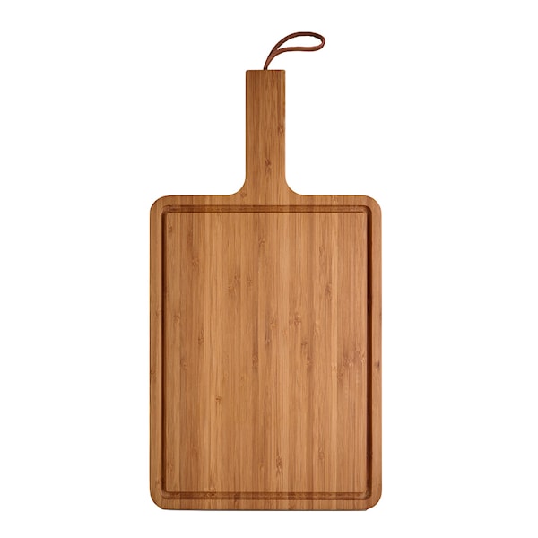 De praktiska saftrännorna ser till att vätska och saft från råvaror stannar på skärbrädan och inte rinner ut på köksbänken. Läderremmen gör det enkelt att hänga upp skärbrädan, vilket ger ett både praktiskt och dekorativt inslag i köket.