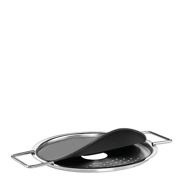 Hällock med silikonduk 16 cm i svart/stål från Eva Trio är en funktionell och praktisk lösning för matlagning. Locket har en inbyggd sil som gör det enkelt att hälla av vätska från kastrullen utan behov av extra redskap. Silen är täckt av en silikonduk som bevarar värme och fukt, och som automatiskt öppnas när du häller, vilket gör att vattnet rinner fritt.