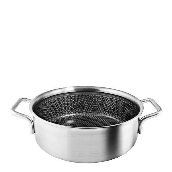 Multi Mosaic traktörpanna med två handtag från Eva Trio, 24 cm, kombinerar tidlös design med modern materialteknologi. Insidan har en slitstark keramisk Slip-Let®-beläggning, förstärkt med rostfritt stål, vilket skapar en yta där maten inte fastnar. Detta underlättar matlagningen och gör det möjligt att använda metallredskap utan att skada beläggningen.