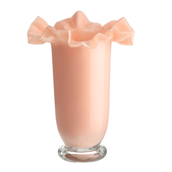 Fanni K Solja vas 17,5 cm persika är en handgjord vas i genomfärgat glas, vars form och färg hämtar inspiration från naturens blommor. Den vågiga kanten ger ett organiskt och livfullt uttryck, medan den dämpade persikatonen skapar värme och balans.
