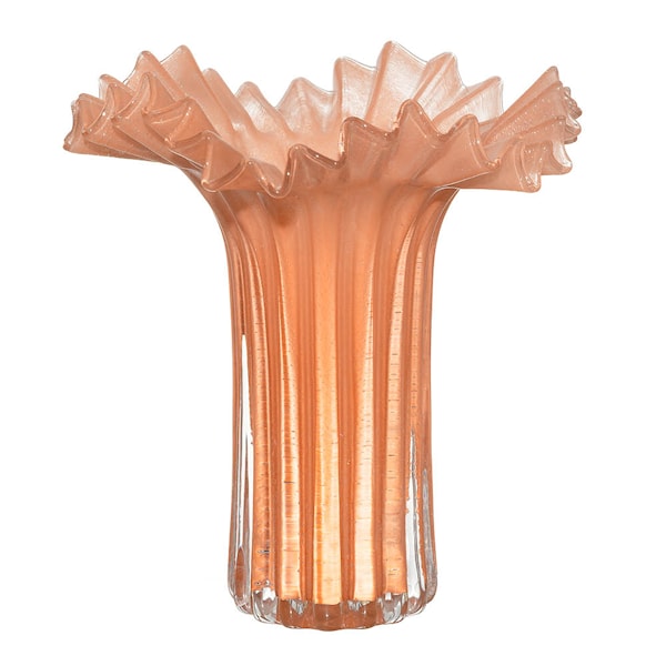Fanni K Tanssi vas 22 cm korallröd är en elegant och handgjord vas i genomfärgat glas med konstnärlig karaktär. Den oregelbundna kanten och de vertikala räfflorna skapar en känsla av rörelse, inspirerad av dans. Den varma persikotonen ger ett mjukt ljusspel och lyfter fram glasets struktur.
