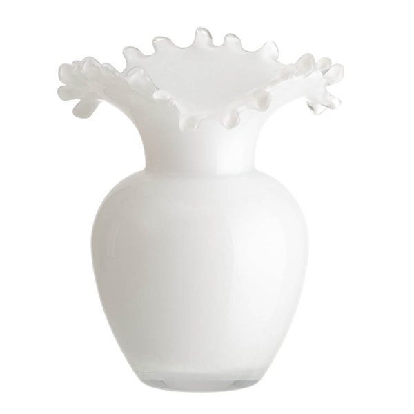 Fanni K Vuolle vas 18 cm vit är en handgjord vas med en karaktäristisk veckad öppning och en stilren vit nyans. Den är tillverkad i genomfärgat glas och har en form som skapar liv och rörelse – ett perfekt tillskott till ditt hem, oavsett om du använder den med blommor eller som dekoration.