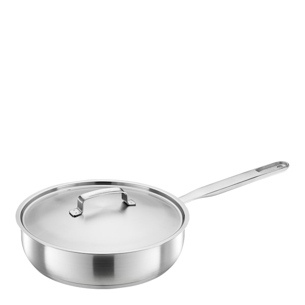 Pannan har en tjock 3-lagersbotten som ger snabb och jämn värmefördelning på alla typer av spisar, inklusive induktion, och den rostfria designen med lock i stål gör att du kan gå från spis till ugn utan problem.