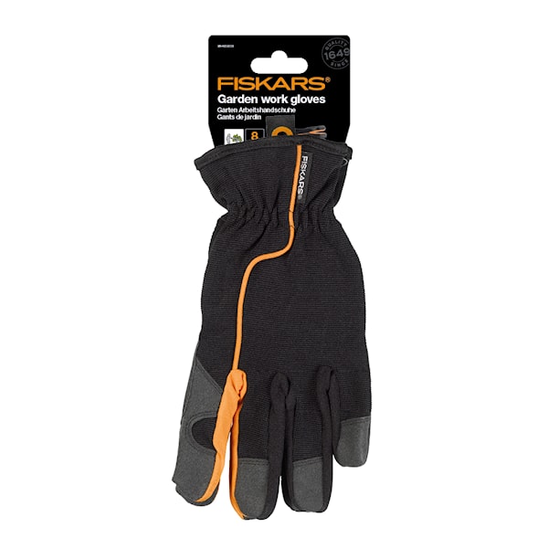 Med trädgårdshandskarna från Fiskars kombinerar du komfort med hög kvalitet. I storlek 8, med de karaktäristiska Fiskars färgerna svart med orangea detaljer och resår runt handleden för extra passform. Handskarna har ett extra tåligt skyddslager i handflatan som gör att handskarna passar alldeles utmärkt för allt från ogräsrensning till vedhantering. Handskarna har även extra skydd för tumme och pekfinger som behövs vid rensning av nässlor, tistlar och andra växter med taggar. De specialsydda sömmarna i fingertopparna ger dig dessutom maximal känsla och perfekt grepp när du tar dig an utmaningarna trädgården.