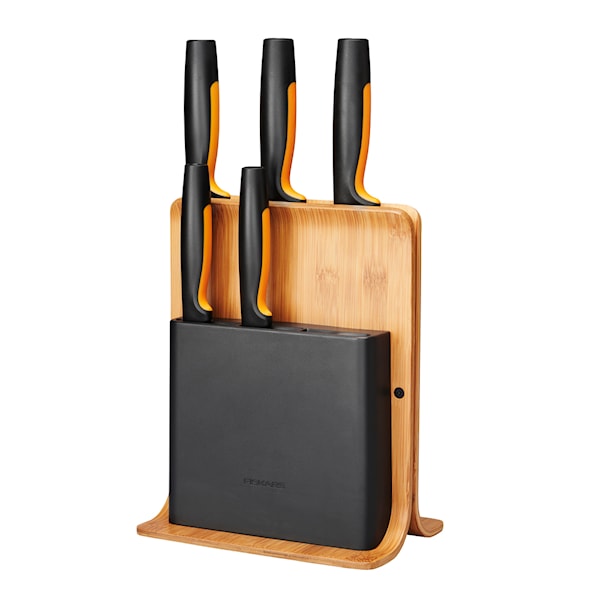 Fiskars Functional Form knivblock i bambu med 5 knivar är en smart lösning för dig som vill ha ett komplett och pålitligt knivset nära till hands. Med ett rent formspråk och materialval som håller över tid, passar det perfekt i det skandinaviska köket.