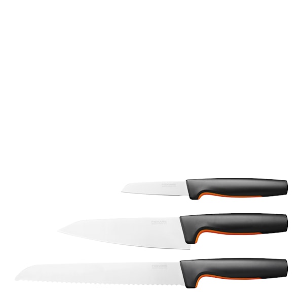 Functional Form Knivset 3 delar är ett komplett set med de mest användbara knivarna, med andra ord ett perfekt startset när du exempelvis ska flytta hemifrån. Tillverkade i rostfritt stål och med Softgriphandtag som gör att de ligger stadigt i handen medan du arbetar. Knivsetet innehåller en brödkniv med en bladlängd på 21 cm, en kockkniv med bladlängd 20 cm och en skalkniv med bladlängd 8 cm. Alla tål maskindisk men vi rekomederar att du diskar dina knivar för han för en längre hållbarhet.