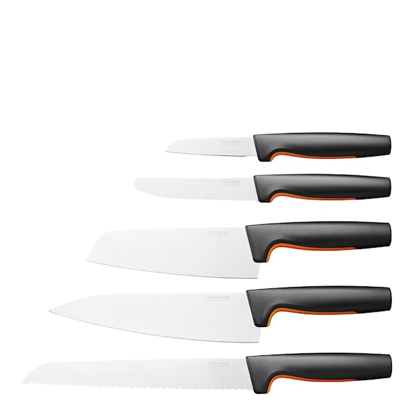 Fiskars Functional Form Stora Knivset 5 delar innehåller de mest användbara knivarna i ditt kök. Tillverkade i rostfritt stål och med praktiska Softgriphandtag som är både bekväma och säkra. Knivsetet är en perfekt present till dig själv men även en mycket uppskattad flytta hemifrån present.