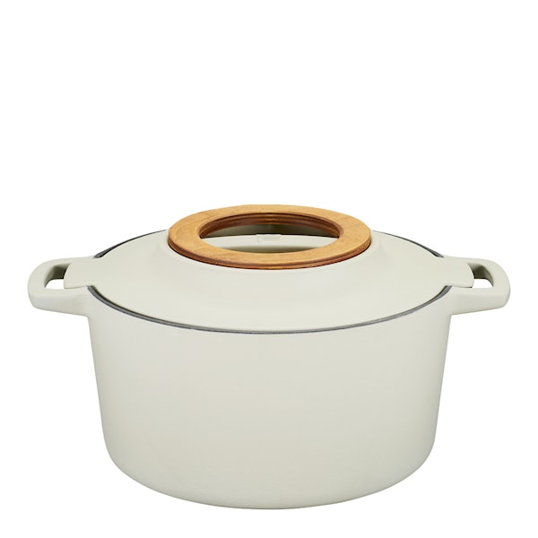 Grytan har också ett integrerat underlägg av finsk björk, vilket ger ett naturligt och funktionellt inslag. Den är kompatibel med alla typer av spishällar, inklusive induktion, och tål temperaturer upp till 270 °C, både i ugn och på spisen. För ugnsanvändning bör träunderlägget tas bort. Grytan ska handdiskas.