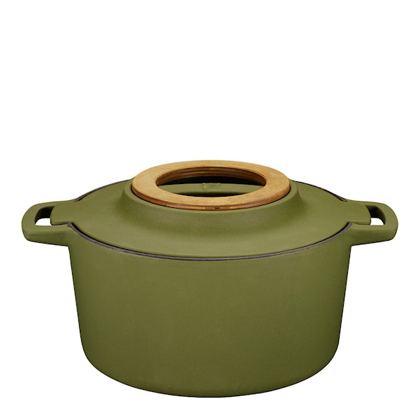 Grytan har också ett integrerat underlägg av finsk björk, vilket ger ett naturligt och funktionellt inslag. Den är kompatibel med alla typer av spishällar, inklusive induktion, och tål temperaturer upp till 270 °C, både i ugn och på spisen. För ugnsanvändning bör träunderlägget tas bort. Grytan ska handdiskas.