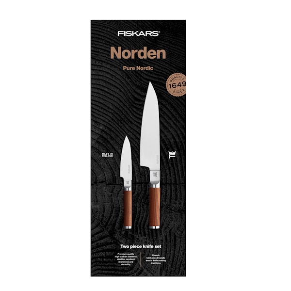 Knivset från Fiskars Norden serie med de två vanligast använda knivarna, kockkniv med en bladlängd på 20 cm och grönsakskniv. Det högkvalitativa bladet är tillverkat av högpresterande, tyskt stål med hög kolhalt, vilket ger överlägsen prestanda och långvarig skärpa. Optimal 26-graders slipvinkel. Knivhandtaget är tillverkat av finsk värmebehandlad björk. Bladhårdhet HRC 56. Handdisk rekommenderas.