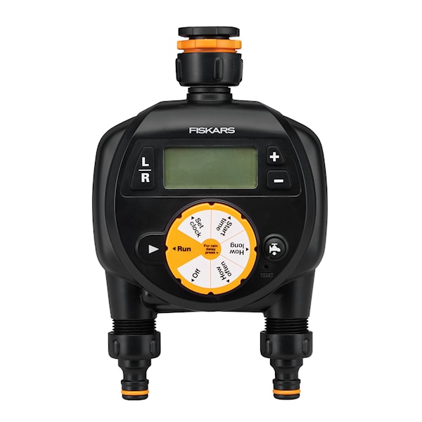 Vattningstimer dubbel till vattenslang svart, från Fiskars. Tids- och vattenbesparande timer med 2-vägskoppling för bevattning av trädgårdar och gräsmattor. Automatisk på/av av vattenflöde beroende på programmering. Stor LCD-skärm och mycket enkel att ställa in önskade lägen på. Underlättar bevattning av din trädgård när det passar dig. Bevattningstid från 1-360 min. Regnförsening upp till 7 dagar. Drivs av 2 st AA batterier (ingår ej) Universalkoppling - passar andra tillverkare
