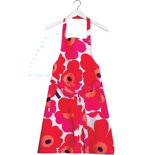 Detta förkläde i 100 % bomull är prytt med Marimekkos klassiska Pieni Unikko-mönster i rött – ett tidlöst blommotiv som ger köksstunderna en extra färgklick. Förklädet har en praktisk frontficka, justerbar nackrem och midjeband som knyts i ryggen för flexibel passform.