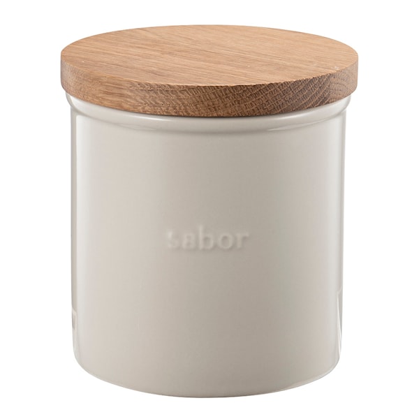 Sabor förvaringsburk på 0,5 liter är en stilfull och praktisk lösning för att organisera ditt kök. Denna burk, med sin eleganta design och moderna färgsättning, bidrar till en harmonisk och välorganiserad köksmiljö. Tillverkad av robust stengods, har burken ett lock i ek som försluts med en silikonring, vilket gör den perfekt för att förvara torrvaror som flingor, kaffe eller pasta och håller dem fräscha längre.