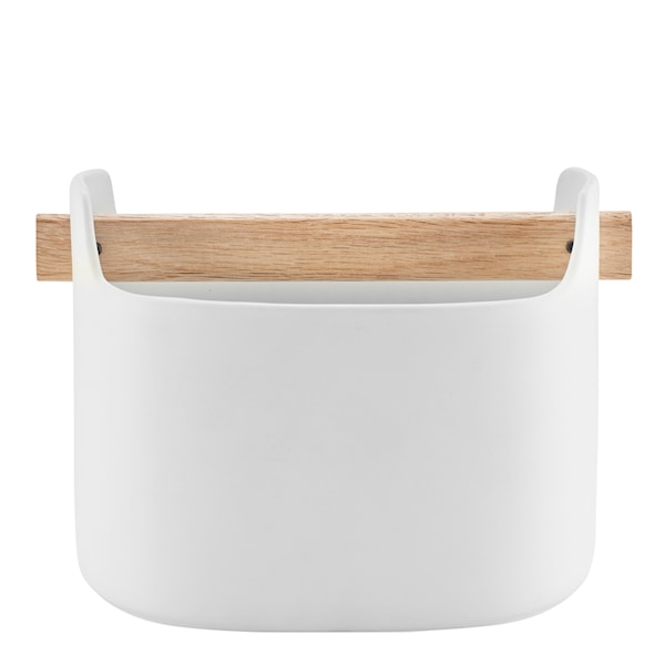 Håll arbetsytan prydlig med Toolbox 15x22 cm från Eva Solo – en elegant och praktisk keramisk förvaringsburk med handtag i ek. Den är utformad för att rymma allt från köksredskap till kontorsmaterial, vilket gör den användbar i flera rum i hemmet.