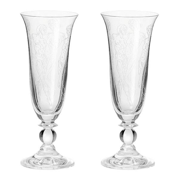 Från Frederik Baggers sortiment kommer detta två-pack med People Flûte champagneglas, var och en med en kapacitet på 15 cl. Dessa eleganta och höga champagneglas är inspirerade av den klassiska franska champagneglasets design, vilket resulterar i en liten yta som hjälper till att behålla bubblorna i glaset under en längre tid. Varje glas är ett unikt konstverk med en ultramodern dekoration som inkluderar ingraverade människokroppar över kön, kropp och ålder, vilket ger dem en unik och personlig touch.