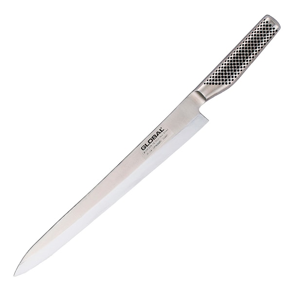 G-14 från Global Classic är en lång enkelslipad sashimikniv med långt, smalt knivblad. Kniven är anpassad för att skära lövtunna skivor av kött eller fisk i ett enda drag, för att få en så fin skäryta som möjligt.