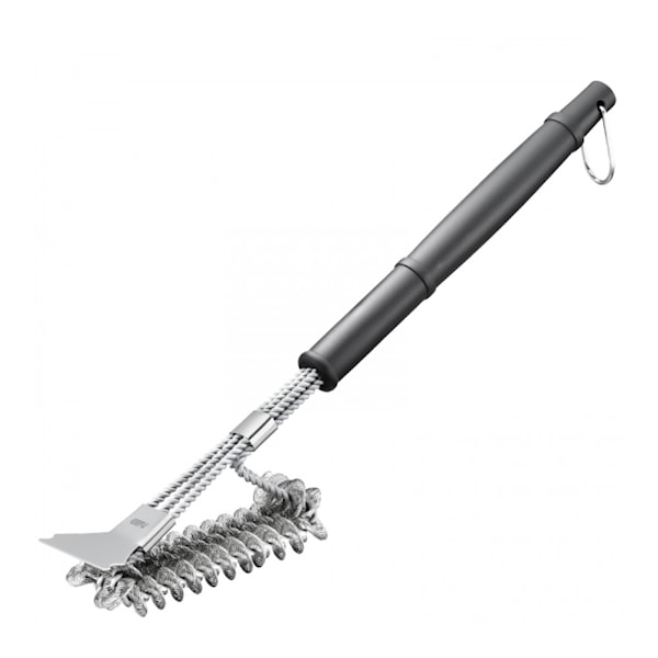 BBQ Grillborste 44,5 cm från Gefu är en högpresterande borste som återger glansen till även de mest förorenade grillgallren. Med sina tätt packade trådvävda stålspiralerna avlägsnar den envisa rester från gallret betydligt bättre än traditionella grillborstar. Den speciella vinkeln mellan handtag och borsthuvud säkerställer optimal kraftöverföring, vilket gör arbetet enkelt. För särskilt svårfläckade rester finns en integrerad, robust stålskrapa. Dessutom möjliggör det extra långa handtaget rengöring av grillen medan den svalnar.