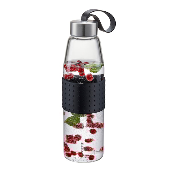 Fyll på med vätska när du är på språng med denna smarta och snygga Olimpio vattenflaska. Den rymmer 500 ml och har en läderrem som man kan bära den i, eller fästa i ryggsäcken. Även perfekt att ha med på gymmet eller kontoret. Runt midjan på flaskan sitter en bred plastring som ger dig ett bra grepp och är skönt att hålla i. Korken är lätt att skruva på och av och är 100% tättslutande. Olimpio är gjord av robust borosilikatglas som inte avger någon smak och passar perfekt till både kalla och varma drycker. En kvalitetsprodukt från tyska Gefu och som hjälper dig hålla vätskebalansen, varje dag!