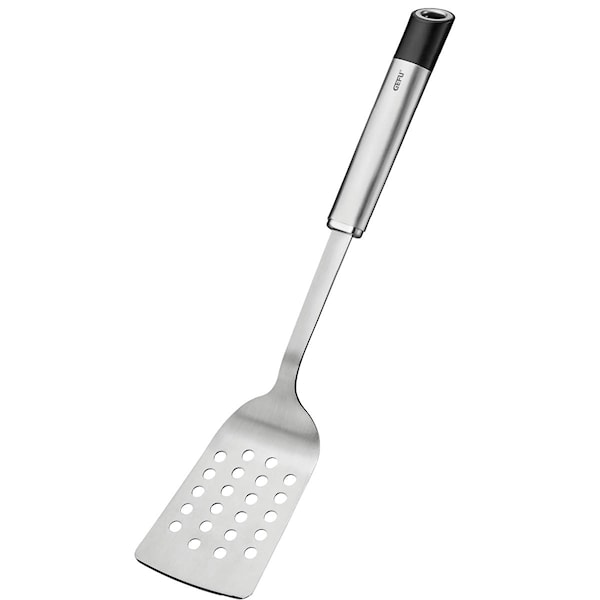 Gefu Primeline stekspade på 36,1 cm är ett oumbärligt verktyg för alla som vill ha enkel och effektiv hantering av biffar, stekt potatis och andra rätter i pannan. Den platta vändytan är utrustad med strategiskt placerade hål som låter överflödig olja och fett rinna av, vilket bidrar till att minska risken för stänk och brännskador under matlagningen.