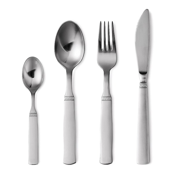- Kniv 20 cm, gaffel 18,5 cm, matsked 18,5 cm, kaffesked 12 cm