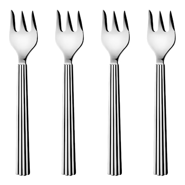 Liten tårtgaffel ur Georg Jensens serie Bernadotte som blir den perfekta efterrättsgaffeln för goda desserter och bakverk. Gaffeln är tillverkad i polerat, rostfritt stål och har en räfflad formgivning som ger dukningen en lyxig känsla. Går att diska i diskmaskin. Säljs i 4-pack.