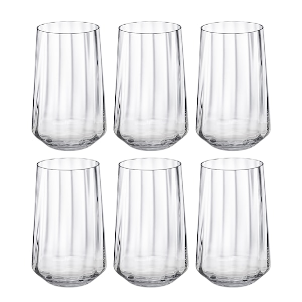 Bernadotte tumblerglas är ett elegant kristallglas som passar lika bra till vardags som vattenglas som fyllt med en gin och tonic till fest. Glaset har en vackert räfflad yta som ger dukningen en sofistikerad elegans, men bidrar även till att glaset blir greppvänligt. Tillverkad i blyfri kristall. Säljs i 6-pack.