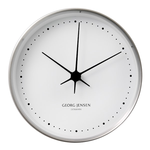 Liten väggklocka i rostfritt stål från Georg Jensen, designad av Henning Koppel. Lättplacerad i och med sin nätta storlek samt med en tidlös och stilren design. I stället för siffror sitter det svarta prickar på urtavlan. Denna detalj har sedan använts i många av Georg Jensens klockkollektioner. Ljudlöst hjälper den dig att hålla koll på tiden och blir en fin inredningsdetalj i ditt hem.