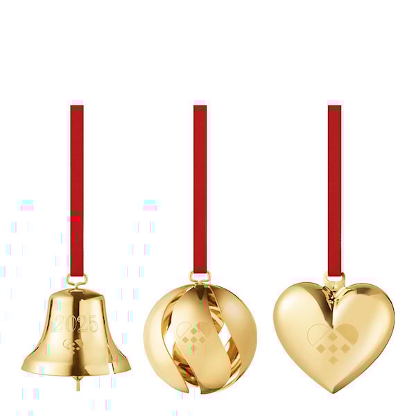 Jul 2025 ornamentset 3 delar i guld från Georg Jensen är ett elegant och nostalgiskt inslag i årets julkollektion. Setet innehåller tre ornament: en klocka, en kula och ett hjärta – alla pläterade med 18 karat guld.