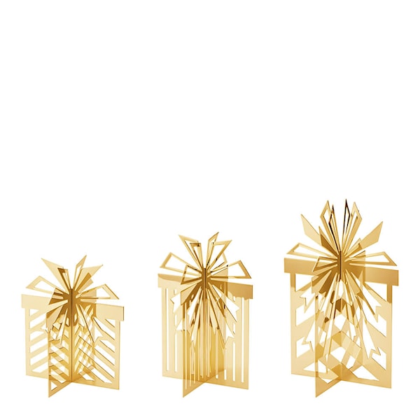 Jul 2025 ornament till bordet, i 3 delar från Georg Jensen, är en hyllning till julens charm och glans. De tre ornamenten är belagda med 18 karat guld och formade som gåvor med rosett – en lekfull och elegant kombinasjon.