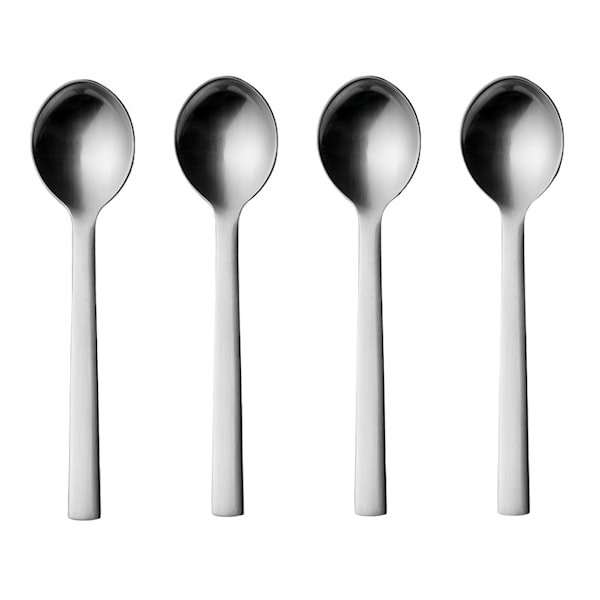 En uppsättning om fyra kaffeskedar från Georg Jensens bestickserie New York, formgiven av Henning Koppel. Skedarnas tidlösa design kompletteras av dess raka linjer som är lika moderna idag som första gången de designades år 1963.