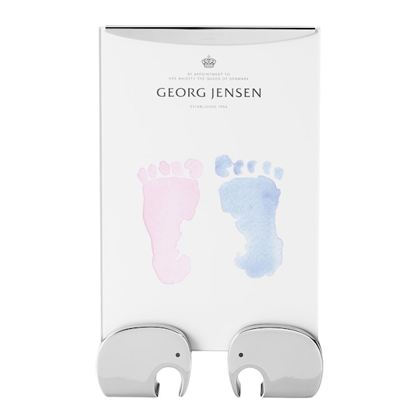 där två små elefanter i rostfritt stål håller upp ramen på sina ryggar och enkelt kan flyttas så att fotoramen kan placeras både vertikalt och horisontellt för att passa motivet. Fotoramen är en fin doppresent eller namngivningsgåva, en klassisk present som aldrig blir omodern.