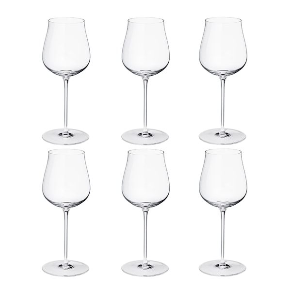 Vitvinsglas i kristall från Georg Jensen ur serien Sky, formgiven av Aurelian Barbry. Den mjukt välvda formen ger en vacker, skulptural känsla och låter vinets aromer nå sin fulla potential i glaset. Tillverkad i blyfri kristall.