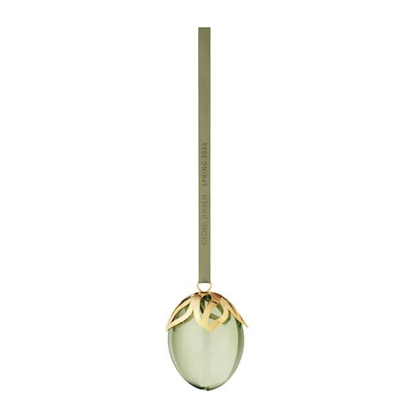 Georg Jensen Vår 2026 ägg i grönt glas med topp i 18K guldpläterat stål är ett utsökt säsongsornament som ger hemmet en känsla av vårens stilla förvandling. Det munblåsta glasägget skimrar i grönt och är unikt för varje exemplar, medan den guldpläterade toppen lyfter fram blomsterinspirerade detaljer.