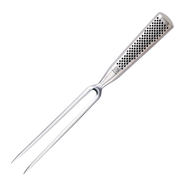 GF-24 från Global Classic är en lång och smäcker gaffer, smidd ur ett enda stycke. perfekt till tranchering av kött. Precis som då den första Globalkniven framtogs år 1985, tillverkas gaffeln av Globals egen stålblandning Cromova 18 och har Globals karakteristiska prickar på handtaget.