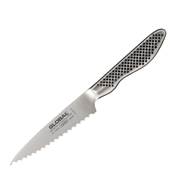 Classic Allkniv GS-108SC 11,5 cm tandad Rostfri från Global är en liten och smidig allkniv som passar att skära det mesta med, från frukt och grönt till kött och fisk.