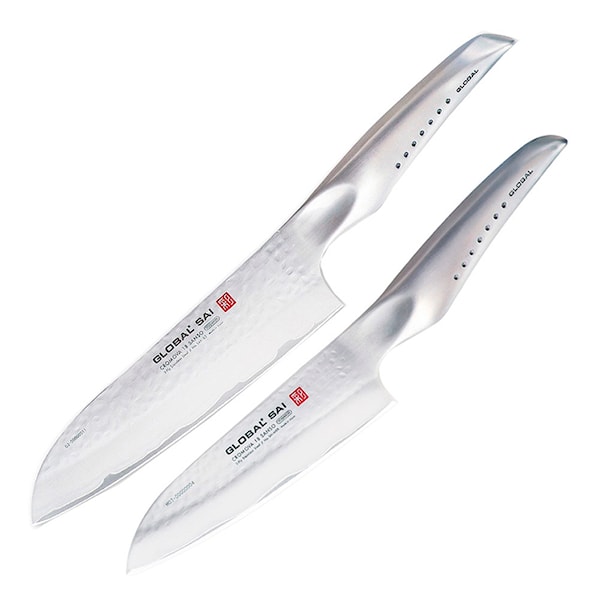 Båda knivarna har ett ergonomiskt tumgrepp för bästa komfort och tack vare att det är av samma stålsort som eggen blir svetsen mellan blad och handtag starkare. Det yttre bladet är individuellt hamrat och ger varje kniv en unik personlighet. Sai har en spegelpolerad egg med Globals karakteristiska snäva vinkel på 12,5 grader. Liksom de klassiska Globalknivarna är skaftet i Global Sai fyllt med sjösand för att ge en perfekt balanserad kniv. Med sin hållbarhet, komfort och exceptionella skärpa blir Globalkniven snabbt en favorit i köket!