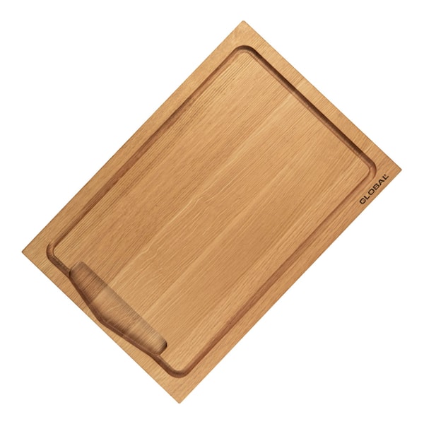 Mycket snygg skärbräda från Global, tillverkad av FSC-certifierad ek. Skärbrädan har en försänkt skåra för avrinning – perfekt för smulor och köttsafter att samlas i. Det finns också ett försänkt handtag, för lättare hantering och nere i ena kanten sitter Globals logga.