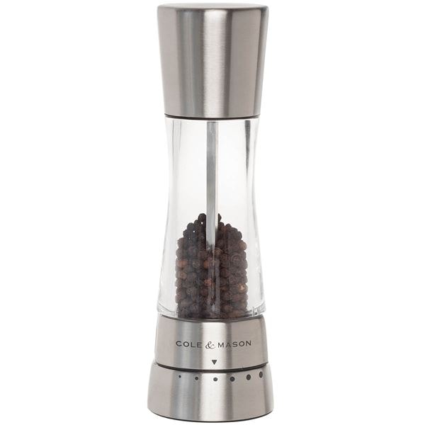 Som en av våra mest kända och mest älskade Gourmet Precision-kvarnar, ger Derwent pepparkvarn med sin eleganta profil i rostfritt stål och akryl professionell kryddning och kontroll till vardagsköket. Vrid bara den rostfria stålringen på Derwent pepparkvarn till 6 förinställda lägen för att uppnå fin till grov malning före och efter tillagning; använd en grov malning för biffar, ett mellanläge för pizza och ett fint läge för soppor och såser. Varje pepparkvarn har ett trycklock för enkel påfyllning. Cole & Mason har varit experter på kryddor i över 100 år, och det är Cole & Masons uppdrag att vara dina partners inom kulinarisk upptäckt. Med produkter för ett brett utbud av krydduppgifter, strävar vi efter att ge dig det du behöver för att maximera smaken av varje måltid; från rester eller en snabb smörgås till en fullständig middagssamling.