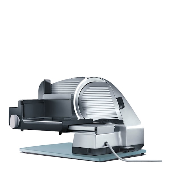 Slicer med kraftig motor och en elegant glasplatta som bas